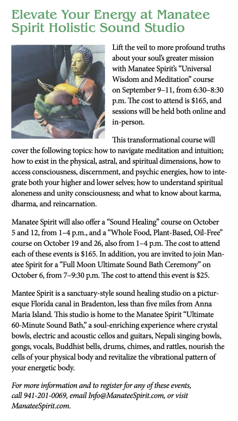 Manatee Spirit presents the UNIVERSAL WISDOM & MEDITATION COURSE, which includes four in-person or online teaching hours. If you have been searching for answers to ancient wisdom revealed, practical ways to begin or enhance your meditation practice, and a roadmap that helps you navigate your soul journey through the physical, astral, emotional, and spiritual dimensions or realms, then the Manatee Spirit UNIVERSAL WISDOM & MEDITATION COURSE is perfect for you!